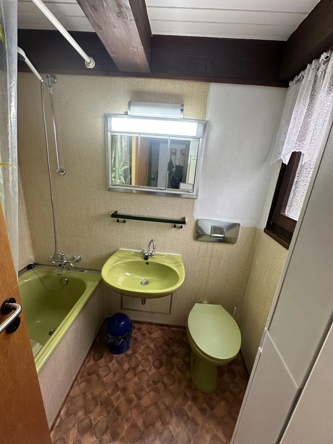 Badezimmer mit Waschbecken, Badewanne und WC.