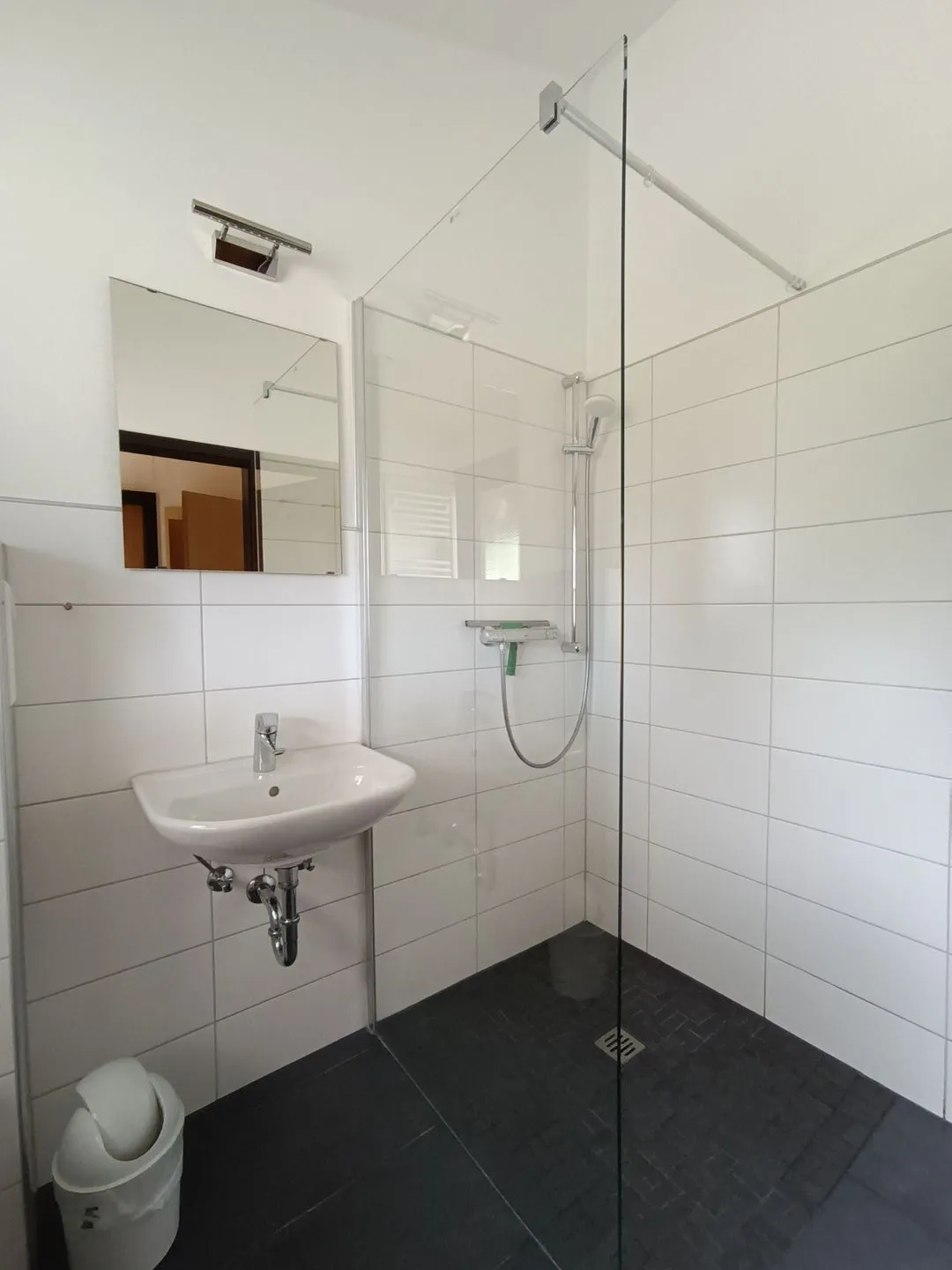 Das Bad wurde 2020 komplett renoviert und verfügt über Waschbecken, ebenerdige Dusche und WC.
