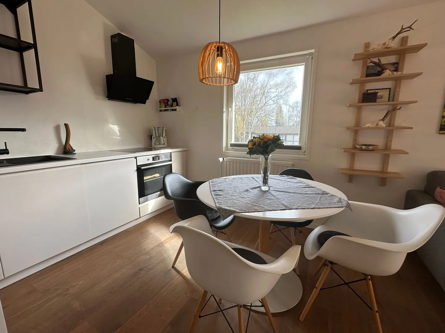 In der Küche finden Sie unter anderem Kaffeemaschine, Wasserkocher, Geschirr, einen Herd mit Backofen und eine Spülmaschine.