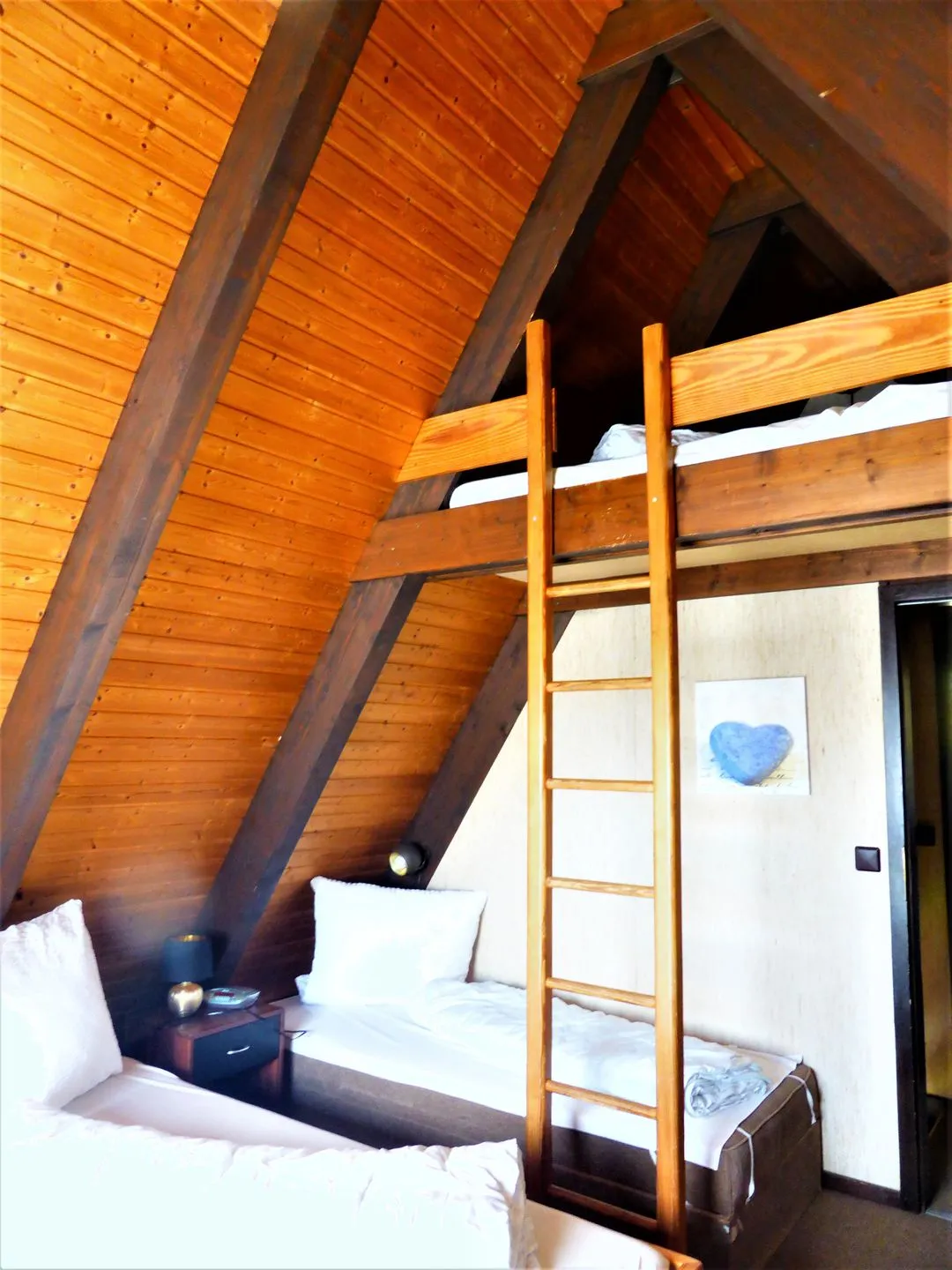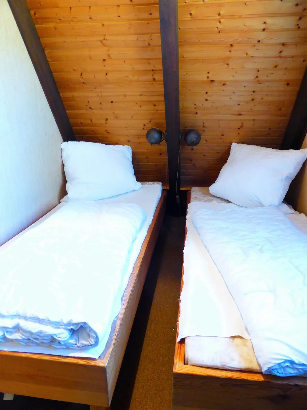 Sie sind aufgeteilt in ein Schlafzimmer mit zwei Betten (80x200) und ein Schlafzimmer mit drei Betten (2x = 90x200 / 1x = 80x200) sowie einer Schlafkoje im Spitzgiebel unter dem Dach (erreichbar über eine feststehende Holzleiter). Dieses Hochbett hat eine große Matratze mit den Maßen 140 x 200 cm. Im November 2022 bekam das große Schlafzimmer zwei neue rückenfreundliche Matratzen.