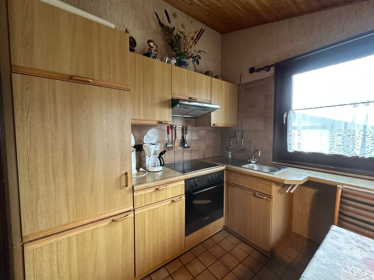 In der Küche befinden sich unter anderem Kaffeemaschine, Wasserkocher, Geschirr und ein Herd mit Backofen.